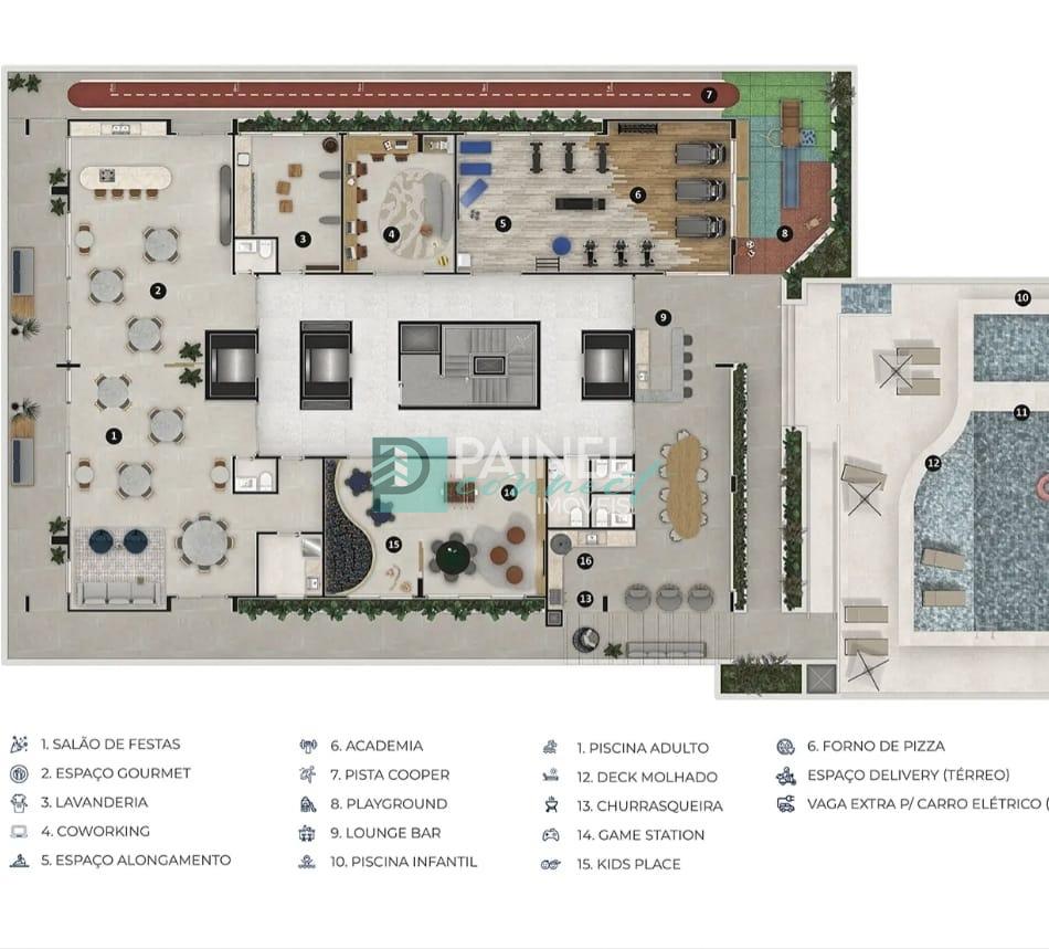 Salão de festas, espaço gourmet, lavanderia, coworking, espaço alongamento, academia, pista cooper, playground, lounge bar, piscina infantil, piscina adulto, deck molhado, churrasqueira, game station, kids place, forno de pizza, espaço delivery (térreo), vaga extra para carro elétrico (térreo)