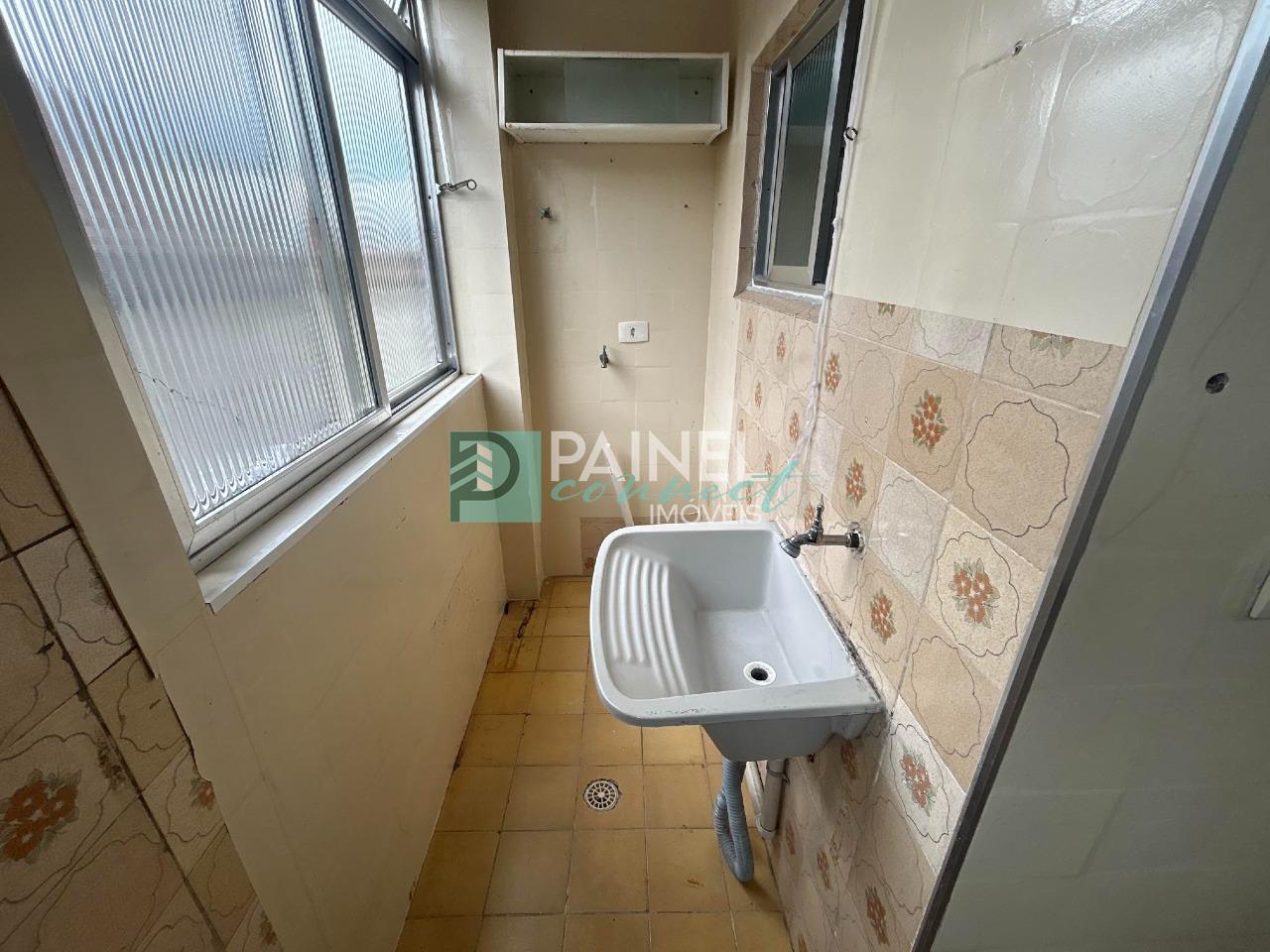 Sala ampla, 2 dormitórios, banheiro social, cozinha com armários, área de serviço